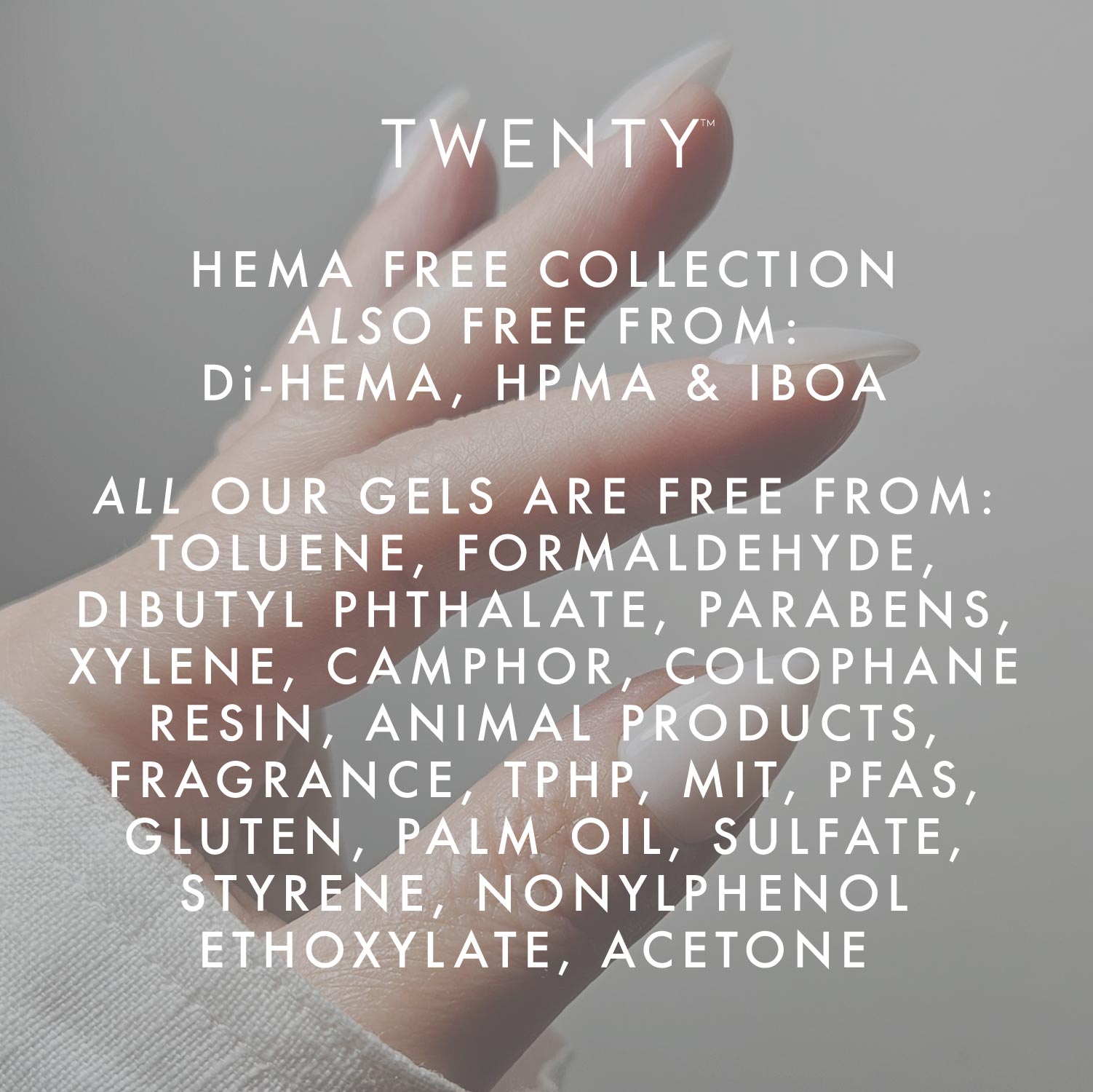 TWENTY™ HEMA-Free range - formulated, manufactured and bottled by industry leading biochemists. Offering the same great coverage and long lasting wear that you’ve come to expect from TWENTY products. HEMA and Di-HEMA free, our formulas are suitable for those with previous HEMA sensitivities.
