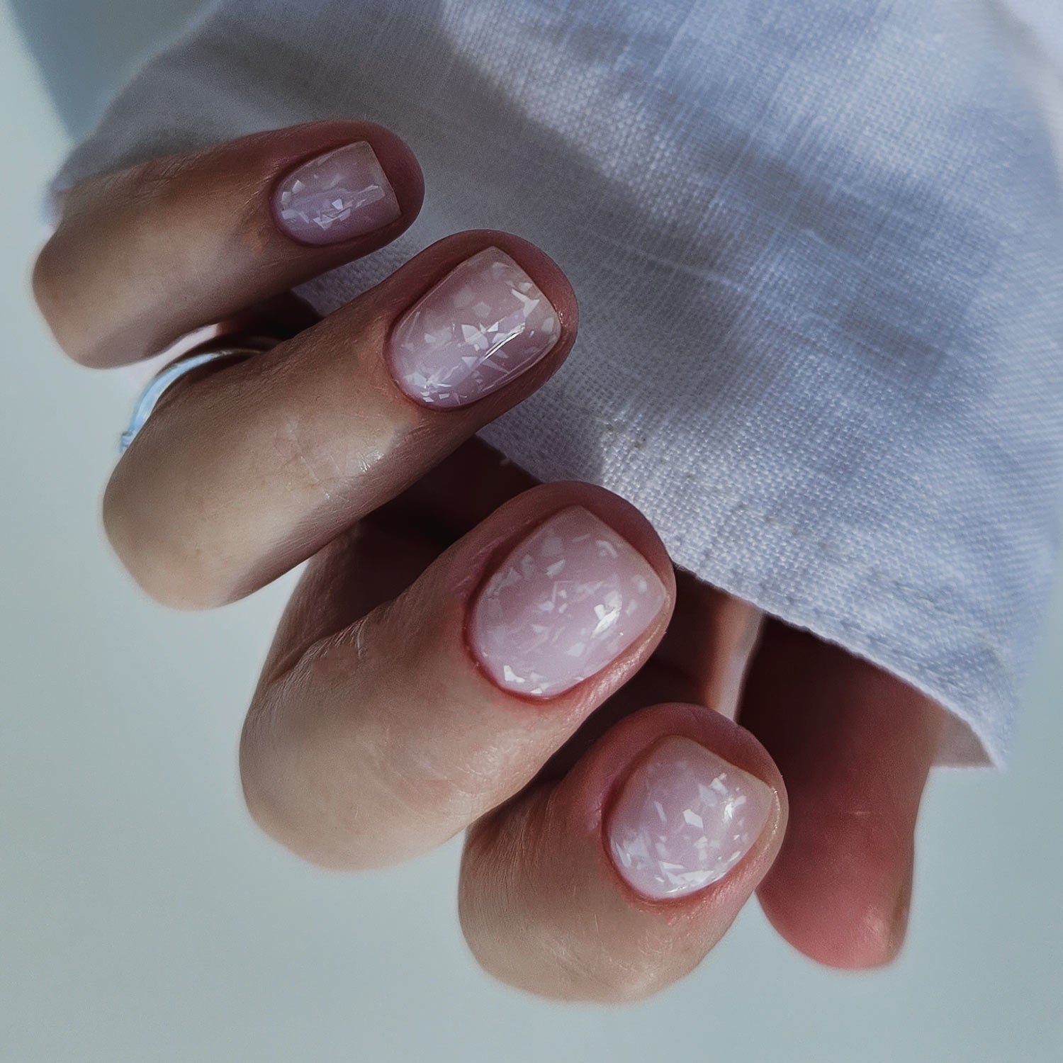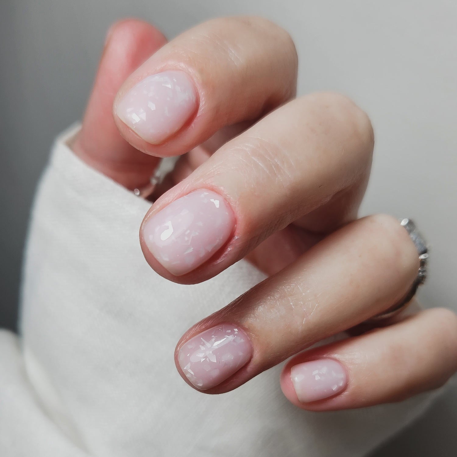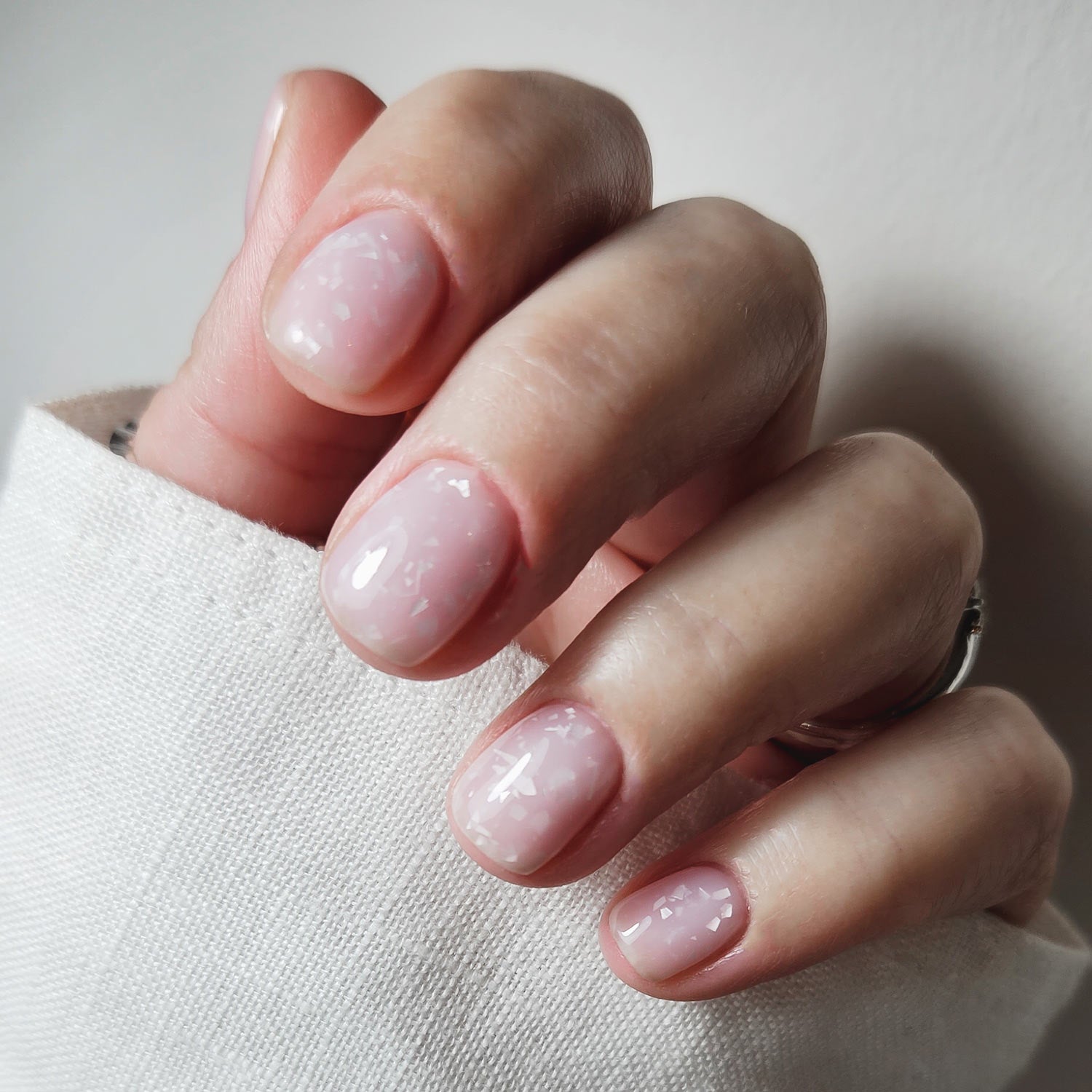 Gratitude, part of our 'Glitterati' BUILD & BOOST™ collection, is a sheer lilac toned bottled builder gel with delicate shards of white and silver foil flakes.
