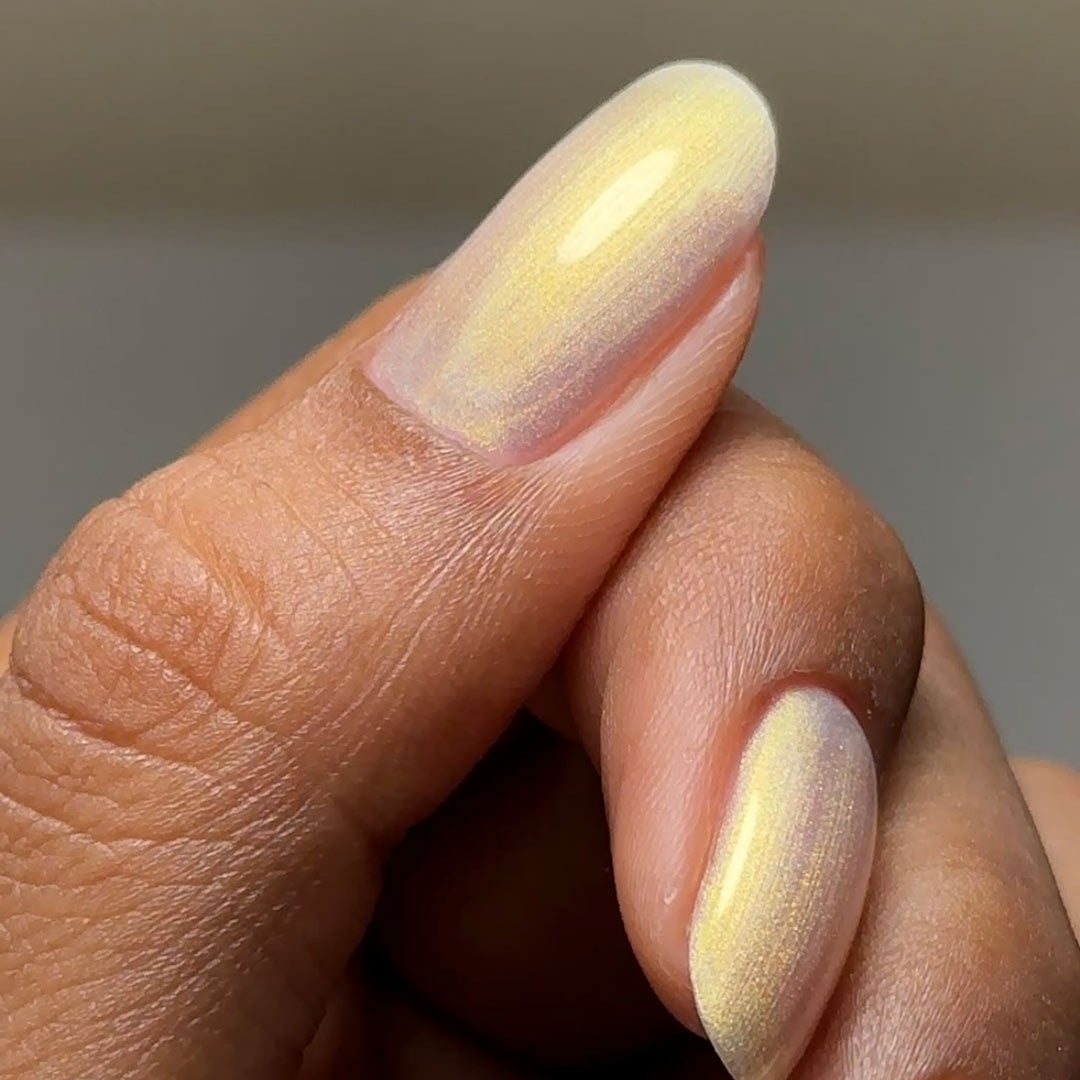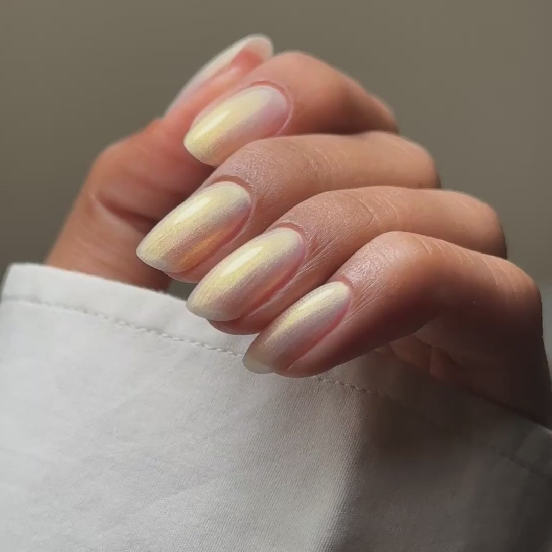 Whisper – A luminous cream pearlescent shade with delicate hints of gold, creating a truly captivating glow. Soft and elegant, this shade subtly shimmers in the light, adding a touch of warmth and radiance to any manicure. Perfect for those seeking an understated yet luxurious finish, Whisper is the ultimate blend of sophistication and subtle sparkle.
